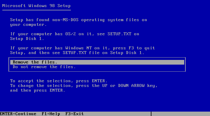 Win98 will not see the ArcaOS partition and will think C:\ is the first partition and will ask you to format it. Windows will format it as FAT32. Here I did some trick, since Windows 98 seem that didn't like how ArcaOS made the first partition, I pressed "F3" to go to Windows98 command line and run FDISK. I deleted the first partition and recreated it with FDISK.