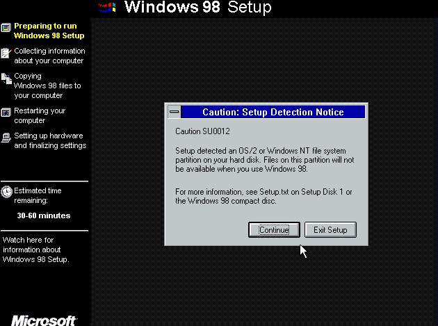 Windows 98 is not a nice player, it will ask you to remove any other OS, JUST SAY NO!!! :)