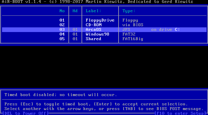 Once ArcaOS finished instaling, you will see at book AirBoot first and them it will boot ArcaOS.